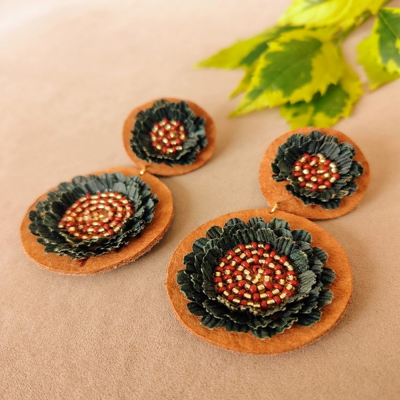 ARETES EN CUERO CON FLORES EN AMERO