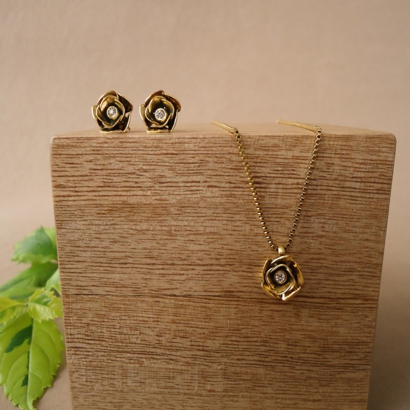 Diseño elaborado en acero y dije en forma de flor y cristales de murano, lo complementa unos aretes topos en forms de flor .