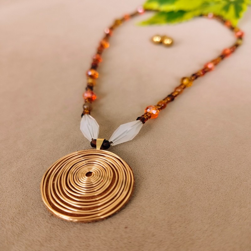 Pieza hecha a mano por artesano Colombiano. Elaborado en murano color terracota, apliques dorados en acero,dije en cuero. Lo complementa unos aretes topos en acero. Diseño y color ùnico.
