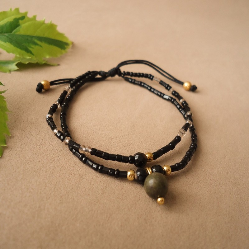 Pieza hecha y tejida a mano por artesano Colombiano. Elaborada con piedra natural onix, cristales de murano, hilo negro. Con ajuste de cierre perzonalizado a la muñeca de la mano. Diseño y color ùnico.