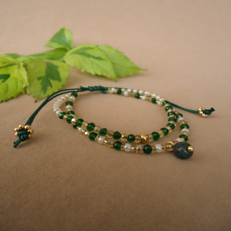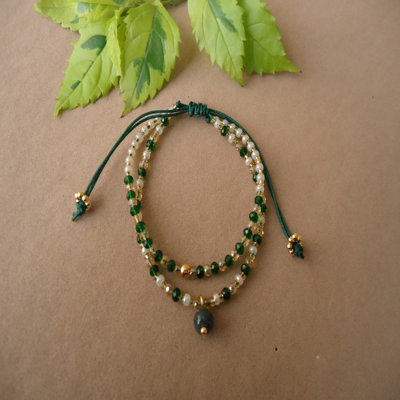 Elaborada en hilo verde esmeralda, cristales de murano color verde y champaña, con perlas, apliques dorados en oro golfilled y piedra natural ( jade verde)