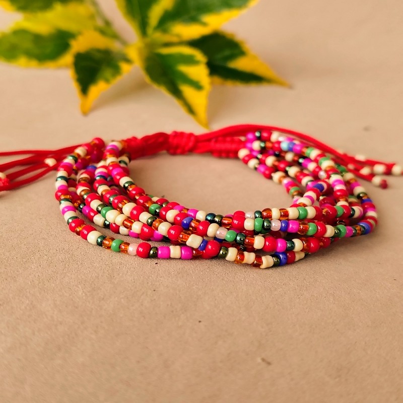 Pieza hecha y tejida a mano por artesano Colombiano Elaborada en hilo y murano color rojo, con apliques y dijes en oro golfilled. Con ajuste de cierre personalizado. Diseño y color ùnico.
