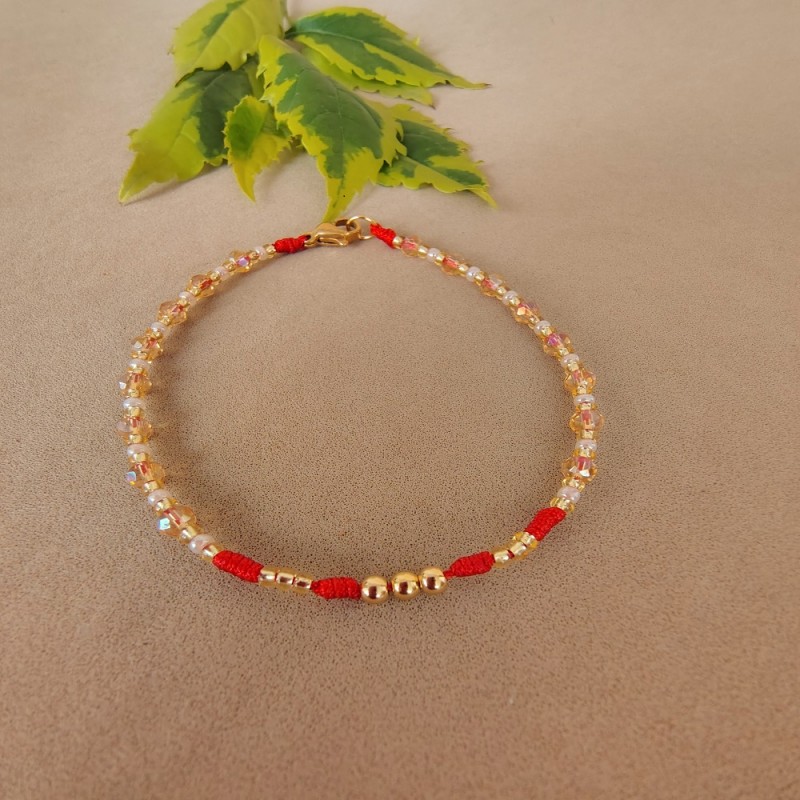 Elaborada en hilo rojo en nudos ,pedreria en murano color champaña, mostacillas doradas y perladas. con apliques y dijes dorados en acero.